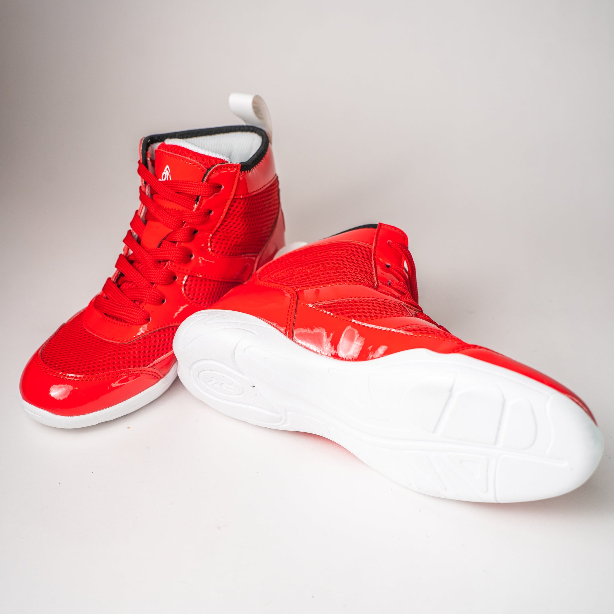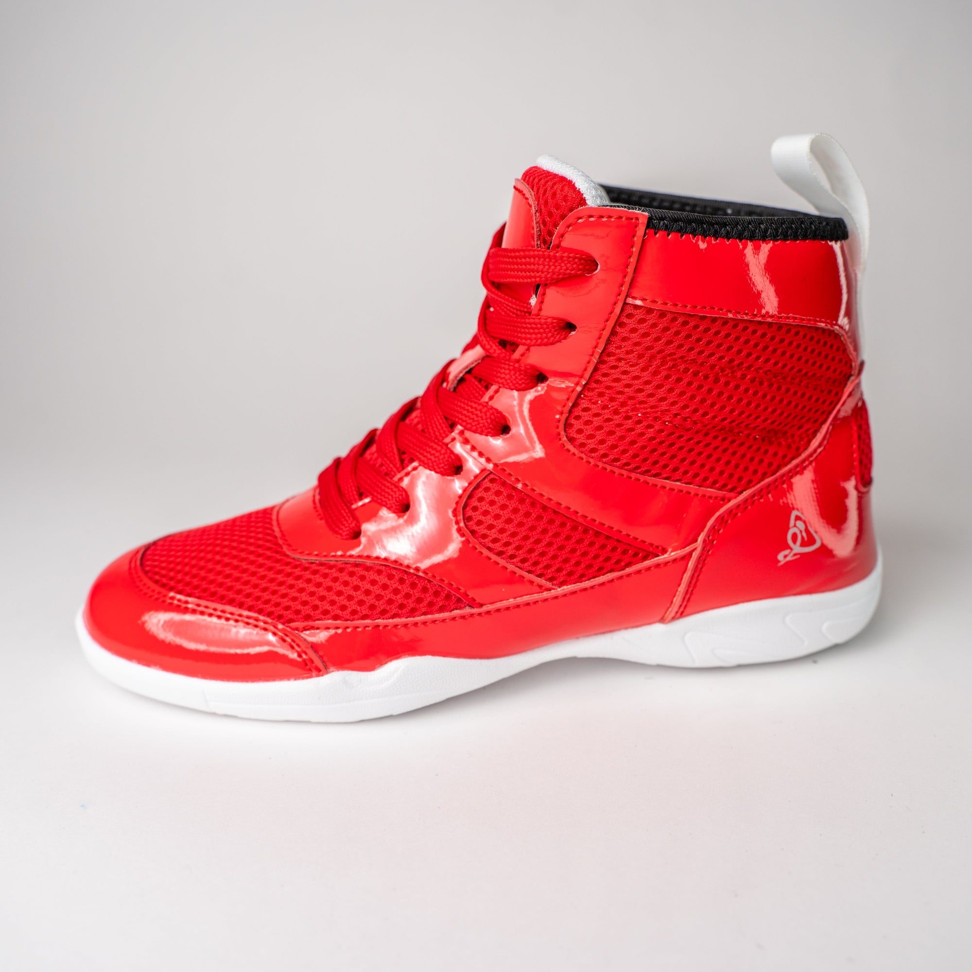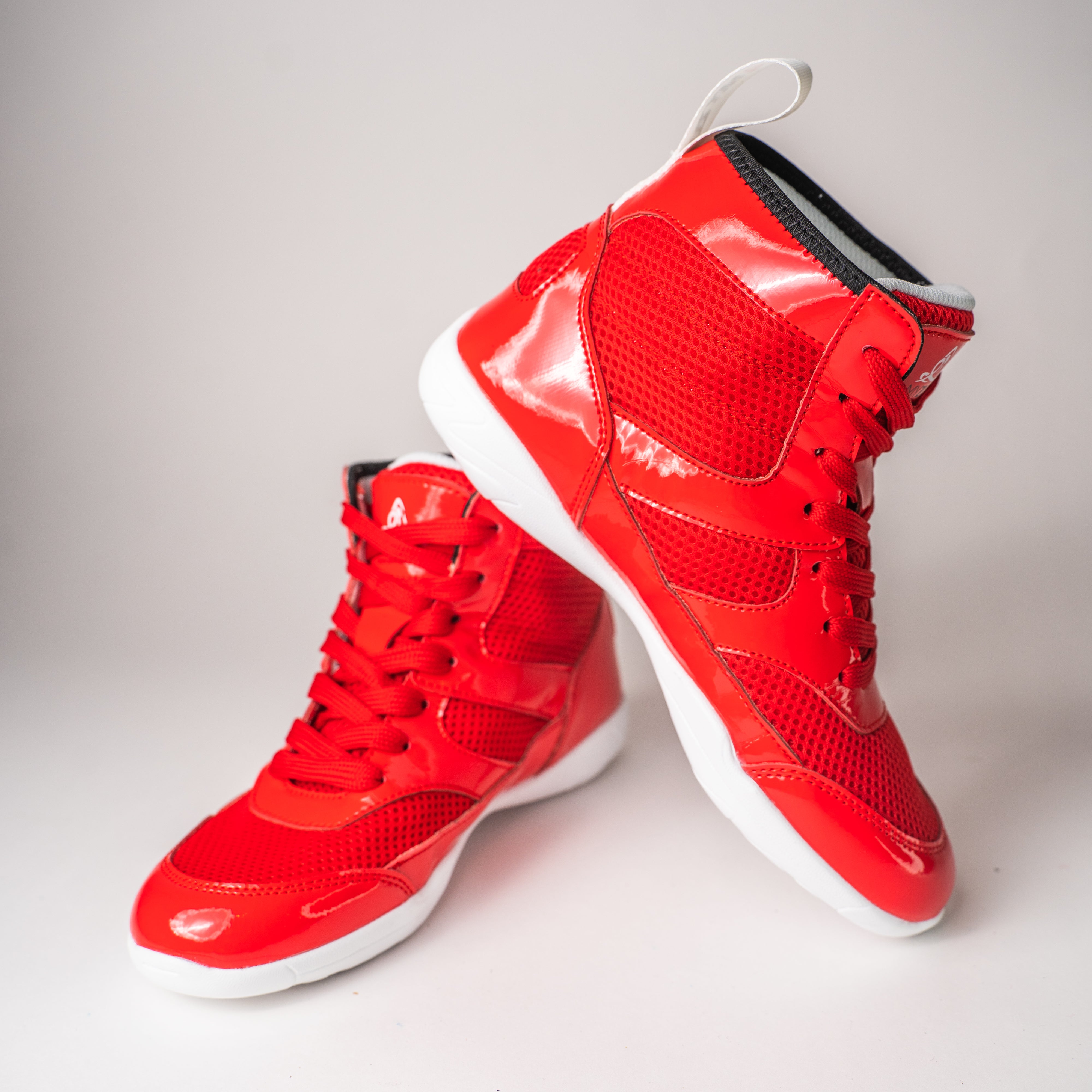 Featuring a vibrant red glossy vegan material and breathable mesh, these unisex sneakers offer invigorating style for every routine.